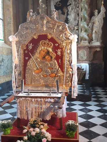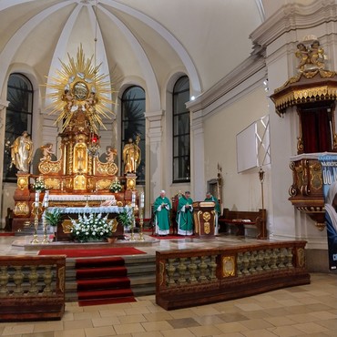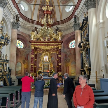 In Heiligelinde (Swieta Lipka) Eucharistiefeier in der Wallfahrtsbasilika Mariä Heimsuchung. Hier traf Pfarrer Scholtz zufällig einen Mitbruder aus der Zeit in Russland. In Konzelebration feierte er die Messe mit dem polnischen Priester. Nach einem kleinen Imbiss verfolgten wir ein kleines Orgelkonzert mit beweglichen Figuren an der Orgel.