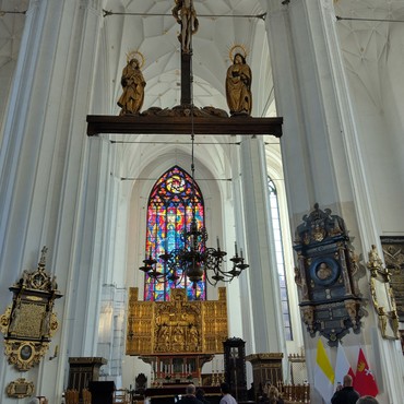 Mit einem Gästeführer sind wir durch die Altstadt. Die weltgrößte Backsteinkirche, die Marienkirche war auch im Programm. Beeindruckend die riesigen Ausmaße der Kirche mit der Größe, den hohen Gewölben, sowie der astronomischen Uhr aus dem 15. Jahrhundert. Wenn man überlegt, wie stark Danzig zerstört war, kann man nur staunend bewundern, wie polnische Handwerker die Stadt wieder aufgebaut haben. Sie ist einmalig schön. Mit dem Bus ging es dann nach Oliva (Oliwa) zur Besichtigung der Kathedrale. In Oliva fand Kaller im Februar 1945 Zuflucht beim Danziger Bischof Carl Maria Splett. Mit dem Bus ging es dann an der Danziger Werft und dem Denkmal für die gefallenen Werftarbeiter von 1970 vorbei zur Brigittenkirche. Der 11 Meter hohe Bernsteinaltar in Form einer aufstrebenden Lilie erinnert an jene Werfarbeiter, die bei Protesten im Dezember 1970 ums Leben kamen.