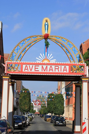 Alljährlich sind die Festtage zu Maria Himmelfahrt ein großes Ereignis, zu dem Menschen aus nah und fern nach Warendorf kommen, um eine Wallfahrt zur glorreichen Jungfrau von Warendorf zu unternehmen, die bereits seit mehr als 250 Jahren hier verehrt wird. Zahlreiche Votivgaben zeugen davon, daß Menschen Hilfe in Not durch die Gottesmutter zuteil wurde. Zu Maria Himmelfahrt werden neun riesige Marienbögen in der Stadt aufgestellt und am Samstag Abend wird die Stadt allein durch rote Laternen, die dort Bungen genannt werden, erleuchtet, was die Stadt in ein heimeliges Licht taucht. Unter jedem Marienbogen spielt eine Blaskappelle Marienlieder und in jedem Schaufenster sind Mariendarstellungen zu sehen. Am Sonntag dann ist die große Sakramentsprozession, die durch die neun Marienbögen läuft und mit dem sakramentalen Segen in St. Laurentius ihren Abschluss findet. Herzlich möchte ich Sie zu dieser Fahrt, die ein unvergessliches Erlebnis werden wird, einladen.