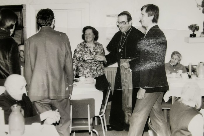 Das Diakonat im Altersheim St. Josef begann für uns in den 70er Jahren. Wie lange es vorher schon Mädchen gab, die es machten, weiß ich nicht. Es bedeutete, die Ordensschwestern ein wenig zu entlasten, indem wir am Wochenende kleine Dienste wie Tischdecken, Saubermachen, mit den alten Leuten spielen und Erzählen übernahmen. Später übernachteten oder wachten wir zu zweit von Freitag bis Samstag oder Samstag bis Sonntag im Schwesternzimmer. Dazu gehörte, nach den alten Leuten zu schauen, auch mal den Schieber zu wechseln oder die feucht gewordene Unterlage, Pampers gab es noch nicht. Wenn sich etwas im Flur bewegte sprang, eine auf und schaute nach. Ab 0 Uhr begann das „auf die Standuhr sehen“, denn in den Zimmern war meist keine Uhr. Norbert Mann erzählte, dass später regelmäßig Frauen der Gemeinde zu zweit den Nachtdienst auch in der Woche übernahmen. Zu Pfarrer Lewickis Zeiten feierten wir mit den Ordensschwestern und ihm Fasching mit den Bewohnern des Altenheims St. Josef -Heims. Wir sangen mit ihnen, es gab Pfannkuchen und Pfarrer Lewicki zog mit Akkordeon und allen, die ihm folgten, durchs Haus. Mit Kaplan Konrad Schröter spielten wir Jugendlichen Theaterstücke, die wir auch im Essenraum des Heims vorführten. Zum Singen waren wir auch im Pflegeheim. Wir waren nicht die Ersten und auch nicht die Letzten, die diese Dienste taten.