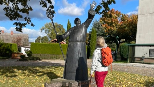 Wartislaw-minneskyrkan är vårt mål. Ett stort tack till ledningen för herrgården Stolpe, som i trogen gemenskap ger oss tillträde. Reliefen ovanför ingången visar den helige Otto av Bamberg och hertig Wartislaw I knäböjande och mottagande Kristi välsignelse.